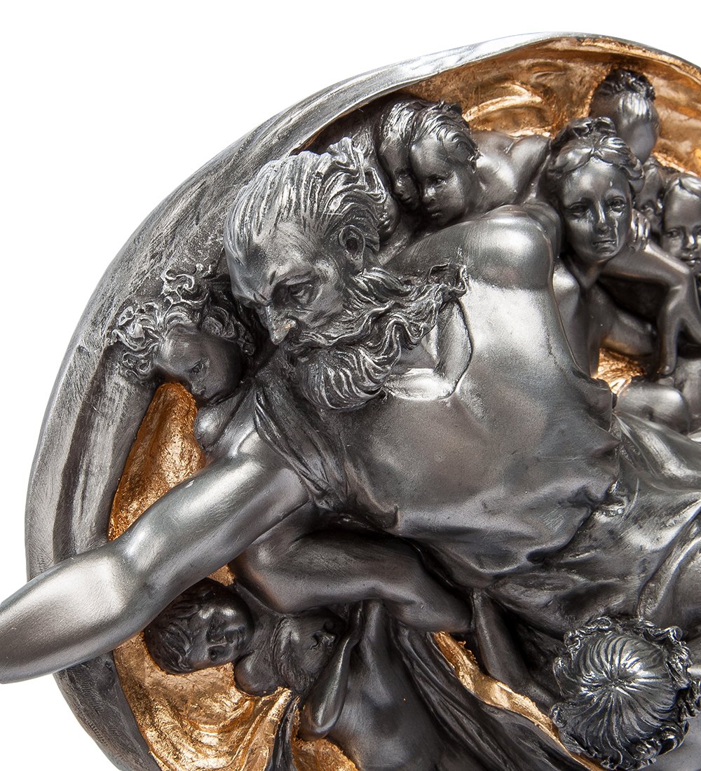 Фигурки сделаны из темного полистоуна и украшены позолотой. Адам изображен лежащим на земле, а Бог-Отец – в овальной капсуле, символизирующей бесконечное пространство и время. Фигуру бога окружает свита бескрылых ангелов.