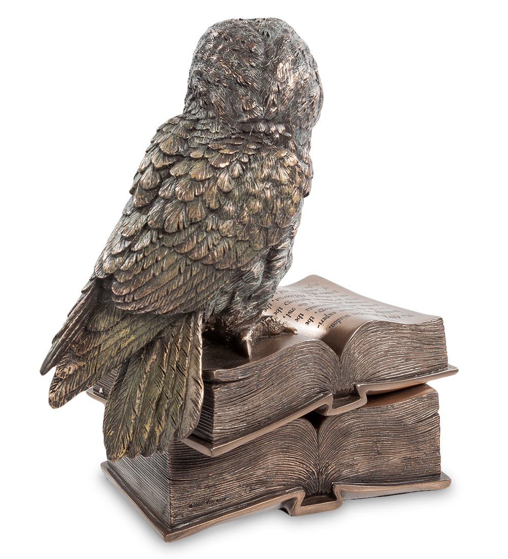 Шкатулка, стилизованная под бронзовую статуэтку совы, прекрасна в своем исполнении. Мудрая сова восседает над книгами, демонстрируя свой ум. В ее взгляде отражаются глубокие знания и книжная эрудиция. Поза совы говорит о ее степенности и самодостаточности. Шкатулка-статуэтка "Сова" станет чудесным подарком со смыслом для интеллектуально развитых людей.