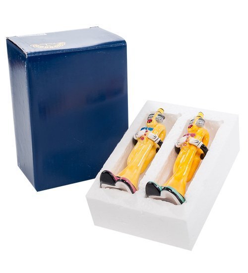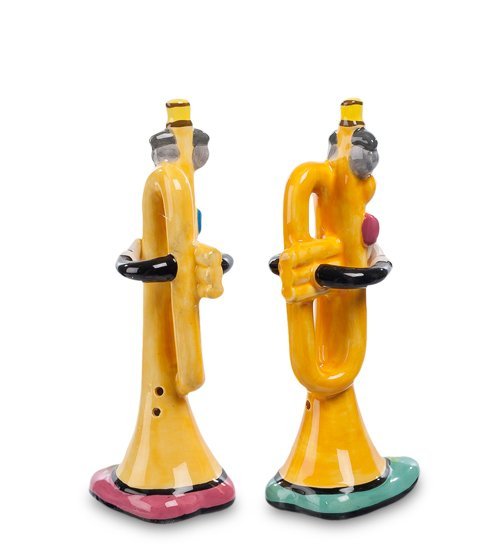 Две забавные яркие фигурки – трубы, исполняющие соло на самих себе. От человеческого образа кроме ручек есть еще по два внимательных глаза с роскошными бровями над ними и ярко накрашенные губы. Основания – стилизованные тапочки, будто стоит такой человечек-труба на столе, смотрит на всех внимательно и предлагает свою тайную услугу: сразу и не угадать, что внутри – специи, самые необходимые на столе – соль и перец.