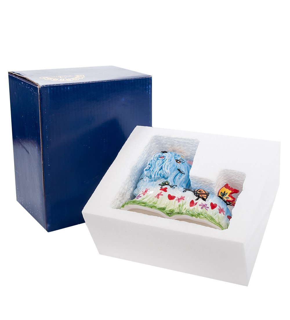 Эта удивительно яркая собачка с голубой шерстью станет для вас символом фантастического дружелюбия и преданности. Собачка как будто выросла среди зеленых трав и красных цветов, некоторые из которых заменены символическими сердечками. Над цветами порхают разноцветные бабочки, садятся на собачку – и она их не трогает – пусть себе садятся. На голове удивительная голубая шерсть перехвачена желтым бантиком, а глаза смотрят внимательно и немного тревожно: я к тебе со всей душой, а ты? Такого песика можно поставить в любой комнате – напоминанием о том, что творения природы дружелюбны к вам: так отвечайте им взаимностью.